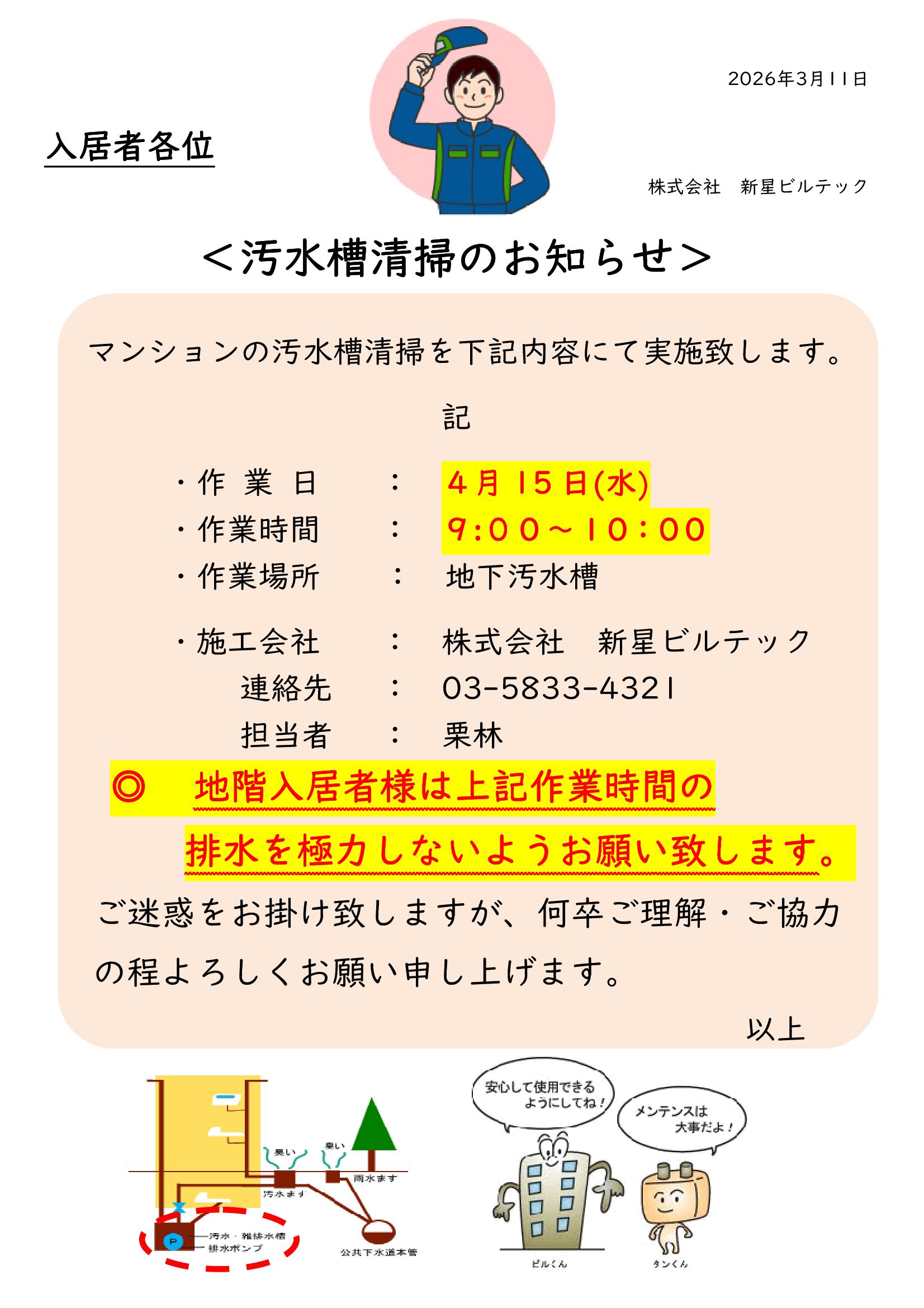 4月15日(水)9時~10時 汚水槽清掃のお知らせ