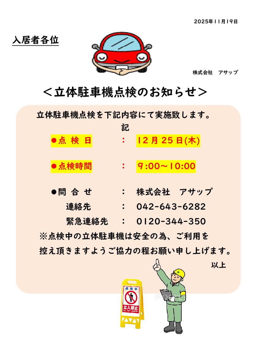 フォンテーヌ駒沢12月度、立体駐車機点検を下記内容にて実施いたします。